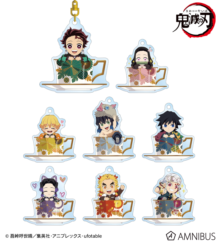 ティーカップに入った竈門炭治郎、竈門禰󠄀豆子、我妻善逸、嘴平伊之助、冨岡義勇、胡蝶しのぶ、煉󠄁獄杏寿郎、宇髄天元のufotable描き下ろしイラストのみにきゃらをアクリルキーホルダーに仕上げました。