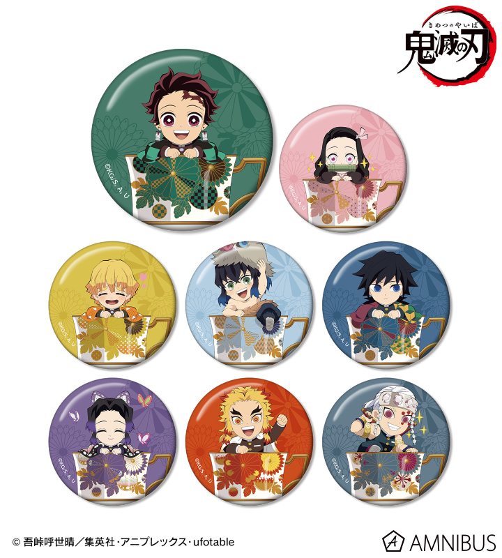 ティーカップに入った竈門炭治郎、竈門禰󠄀豆子、我妻善逸、嘴平伊之助、冨岡義勇、胡蝶しのぶ、煉󠄁獄杏寿郎、宇髄天元のufotable描き下ろしイラストのみにきゃらを缶バッジに仕上げました。